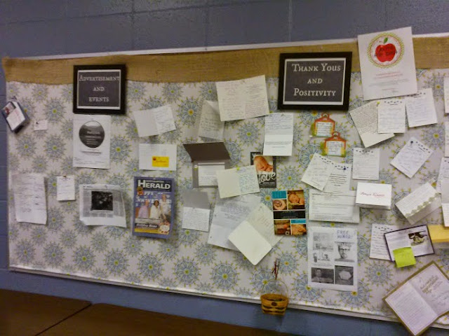 Bulletin board covered in fabric and burlap. This one allows staff to put up articles or upcoming events, and also "Thank You" notes that come in throughout the year. And baby announcements!!!